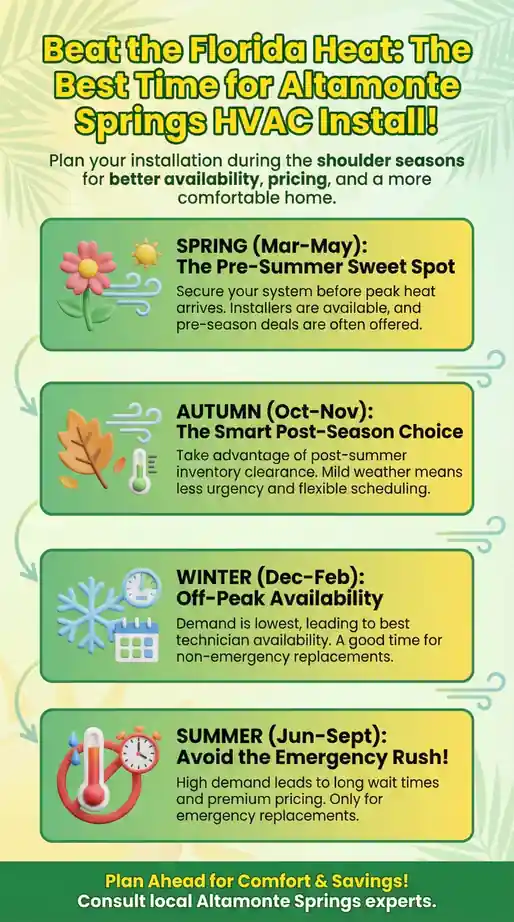 After completing installations across this community through every month of the calendar year, the timing patterns that actually matter for Altamonte Springs homeowners have become clear. Spring and fall still represent the best windows — but not for the reasons most articles cite. The real advantages are contractor availability, rebate eligibility cycles, and the ability to run a proper pre-installation duct assessment without the pressure of a system that failed during a July heat wave driving every decision.